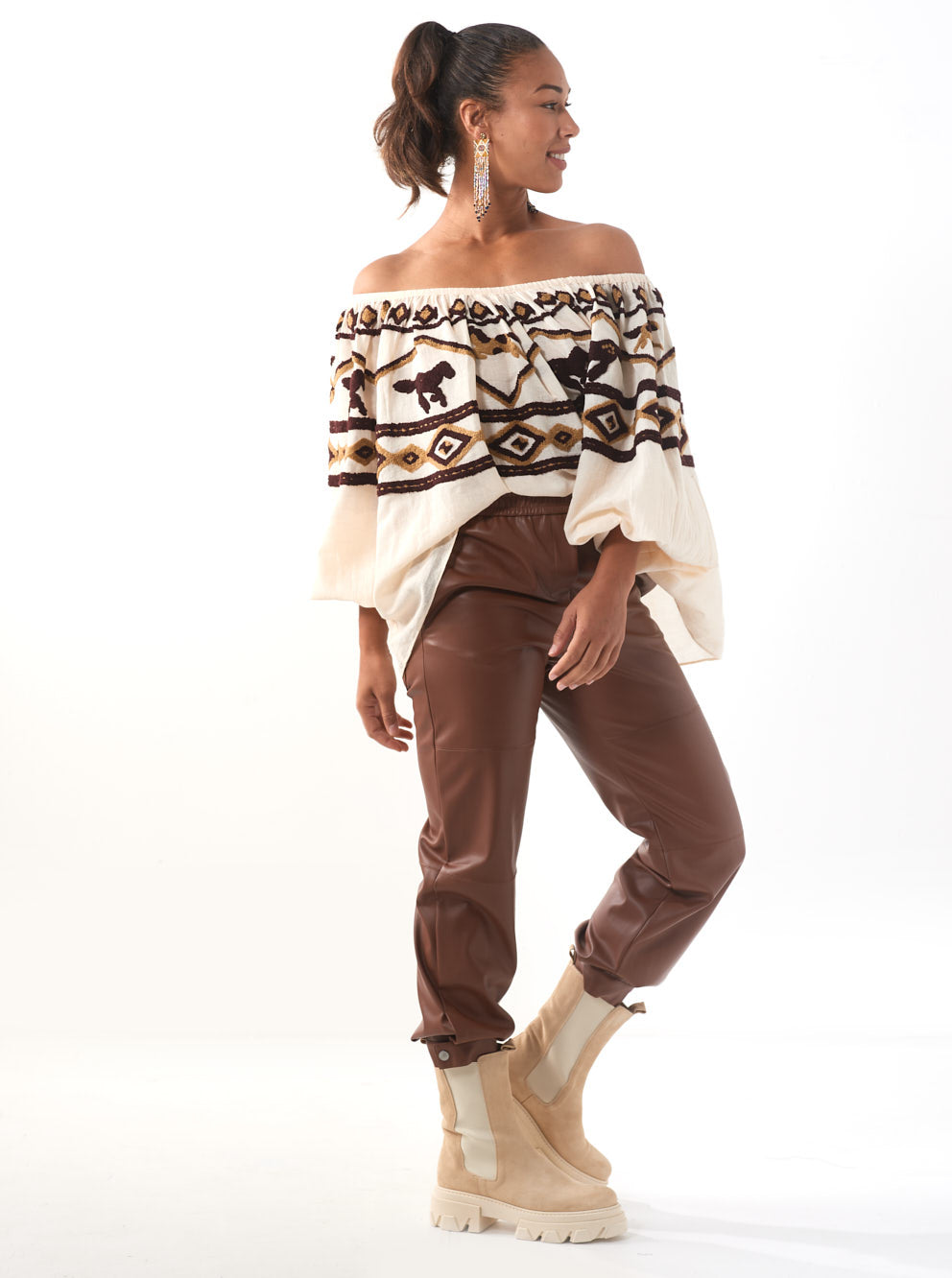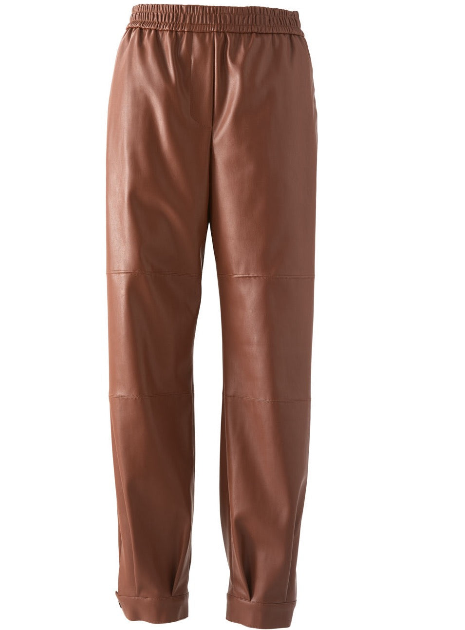 Deze broek is gemaakt van veganistisch leer, heeft een hoge taille, zijzakken en opgestikte achterzakken. De broek heeft een elastische tailleband en manchetten bij de enkels met drukknoopsluiting.